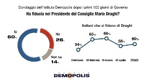 6 italiani su 10 esprimono fiducia nel Premier Mario Draghi: è il dato che emerge dal sondaggio realizzato dall’Istituto Demopolis, diretto da Pietro Vento, dopo i primi 100 giorni di Governo