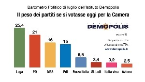 Se si votasse oggi per la Camera, la Lega sarebbe con il 25,4% primo partito, seguita dal PD al 21%; il Movimento 5 Stelle otterrebbe il 16%, con Fratelli d’Italia al 15%: è la fotografia che emerge dal Barometro Politico di luglio dell’Istituto Demopolis, diretto da Pietro Vento. Distanziati appaiono Forza Italia al 6,5%, la Sinistra di LeU al 3,4, Italia Viva al 3,2 e Azione al 2,5%.
