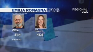 In Emilia il candidato del centrosinistra è oltre il 51 per cento. Netto l'incremento dell'affluenza: il 67 per cento. In Calabria trionfa la forzista Santelli