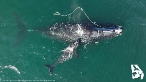 Una balena franca nordatlantica è stata avvistata al largo di un'isola della Georgia negli Stati Uniti, mentre nuotava trascinando una fune da pesca rimasta impigliata nella bocca. Accanto a lei il suo piccolo appena nato
