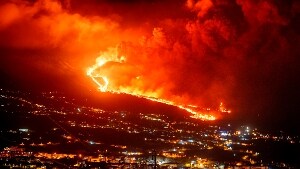 La lava che si riversa incandescente dal cratere del vulcano Cumbre Vieja sull'isola di La Palma continua a distruggere case e a tenere in allerta la popolazione