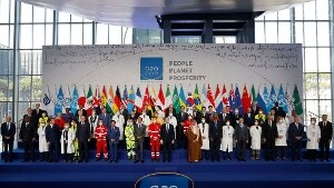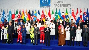 Qualche stretta di mano, qualche abbraccio prima della tradizionale foto di rito seguita da un altro scatto dei leader insieme agli operatori sanitari