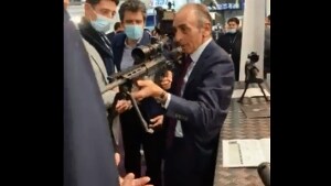 "Qui non si scherza più. Spostatevi, arretrate!", ha detto il polemista, possibile candidato alle elezioni presidenziali del 2022, puntando l'arma per poi riappoggiarla ridendo
