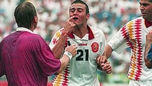 Un fermo immagine tratto da Youtube mostra Luis Enrique nel 1994, allora giocatore della Spagna, con i segni di una gomitata datagli da Mauto Tassotti nel corso del quarto di finale mondiale fra Italia e Spagna. E' solo uno dei tanti episodi di una rivalità che dura da 101 anni