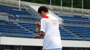 A due settimane dalla cerimonia di apertura, in programma il 23 luglio, la torcia olimpica è stata portata sul palco e consegnata simbolicamente a Yuriko Koike, la governatrice di Tokyo, sotto la pioggia